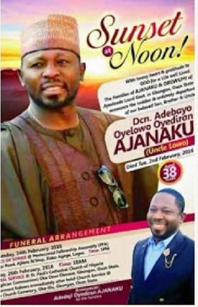 The funeral poster of Mr Oyelowo Oyediran Ajanaku, the 38-year-old Obafemi Awolowo University graduate, killed by his lawyer wife on 2 February in Ibadan, has been released by the family.